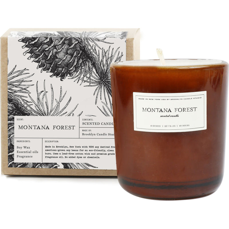 This refreshing scent is inspired by fresh evergreens that grow in the airy mountains of Montana to reminiscent of nature in a far-off place. The Montana Forest Brooklyn candle from Candle Studio original blend of blue spruce, pine, and camphor essential oils and fragrance. These Amber Glass Candles have an ethereal glow that offers an atmosphere reminiscent of huddling by a roaring fire in a dimly lit cabin. Each Brooklyn Candle Studio Candle is made by hand in Brooklyn, New York with soy derived from American-grown soy beans.