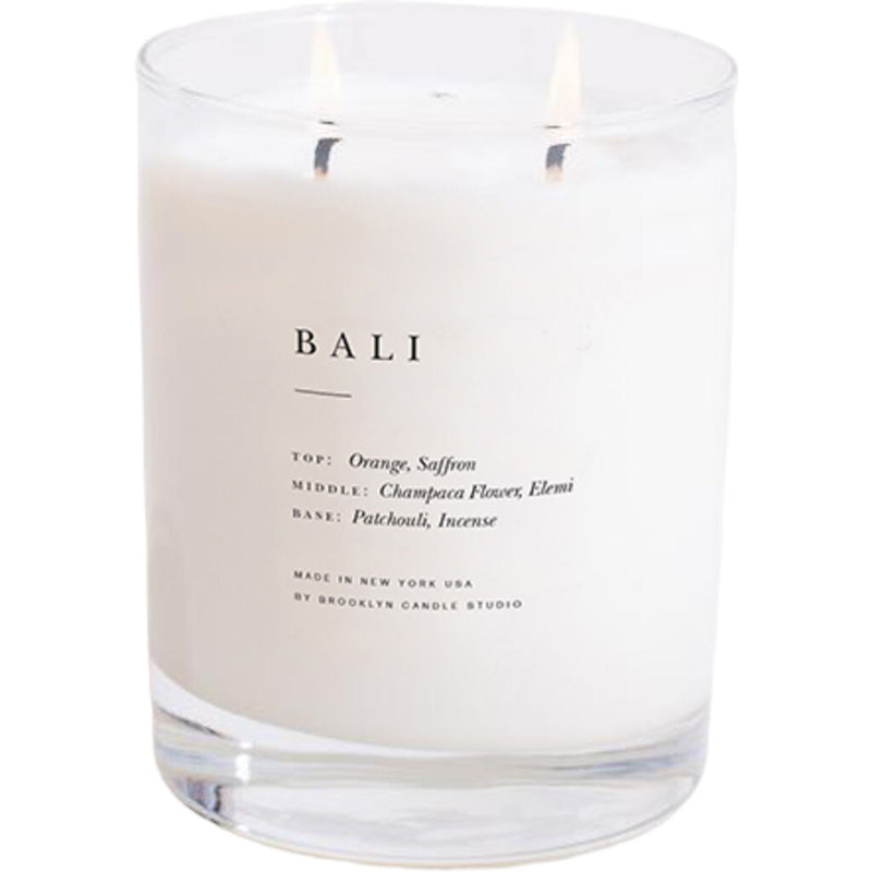 On a balmy day in Bali, the soothing aroma of frangipani incense escapes from a local temple while fragrant champaca petals rain from the sky. Top notes of orange and sweet saffron sing above a heart of magnolia champaca and peppery elemi while notes of smoky incense and patchouli hum quietly at the base. Double-wicked and housed in white textured boxes and screenprinted glass tumblers, this collection will tug at the heartstrings of minimalists around the world. Hand poured by Brooklyn Candle Studio in Brooklyn, New York with 100% soy wax for a clean burn, a cotton braided wick primed with vegetable wax, and fine perfume oils and essential oils sourced from around the world. No phthalates, dyes, or preservatives.