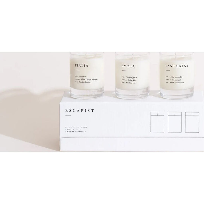 Our Escapist collection takes you to our favorite places in the world, places we’ve traveled to that have a permanent place in our olfactory memories. Pick three to try, gift, or savor individually. Hand-poured in screenprinted glass votives and packaged in a perfectly giftable luxurious textured box.