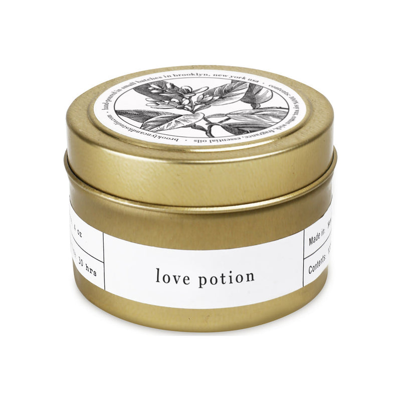 Take a bit of home with you wherever you are with Brooklyn Candle Studio's Gold Travel Tin Candle in Love Potion. The Love Potion Candle boasts light notes of jasmine blossoms, soothing lavender, and ripe mandarin; an olfactory experience comparable to a bouquet of flowers.
