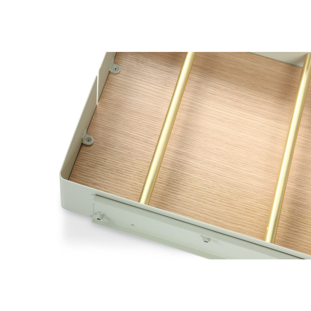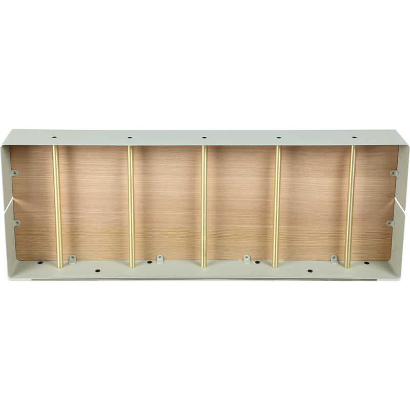 - Materials: Oak veneer shelf, powdercoated steel frame w/black screws and brass bars