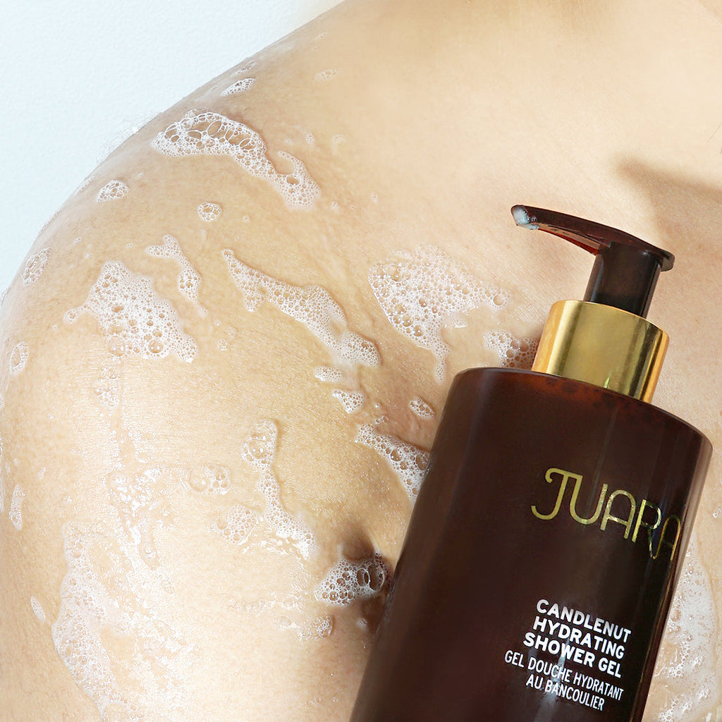 Our Candlenut Hydrating Shower Gel is the first step to fresh, baby-soft skin followed by exfoliation with JUARA Candlenut Body Polish. For a glowing finish, we suggest moisturizing with a bit of Kartini Body Oil and/or Candlenut Body Creme, gently massaging the product into your skin until it is fully absorbed.