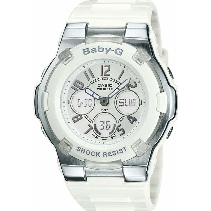 Casio engineers watches that utilize cutting-edge technology combined with innovative design and a bold aesthetic. The Baby-G Shock-Resistant Sport BGA-110-7B Watch in White is designed to balance elegance with ruggedness, featuring Chaton style Bezel protectors, a molded resin band and water resistant at 100M. The hidden strength and resilience of this watch doesn't overshadow it's aesthetic, though, as it has a gorgeous white/silver finish that is stylish yet understated. For a fashionable choice that will also survive the elements and last for years, this is a great choice.