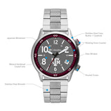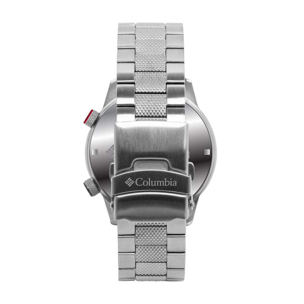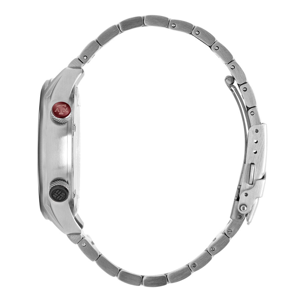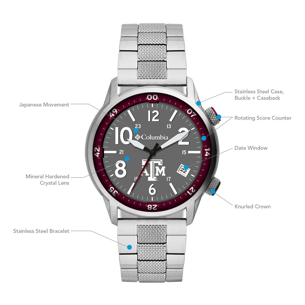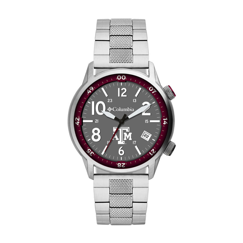 From the Columbia Collegiate collection, this Outbacker style Texas A&M University watch features a Grey dial with white hands and numeric markers, a date display at the four o'clock hour, an internal navigation compass and maroon accents with mineral crystal in a 42.0mm stainless steel case. The reliable quartz movement keeps you right on time. The polished and textured stainless steel link bracelet secures with a push-button deployment clasp. Water-resistant to 50 meters
