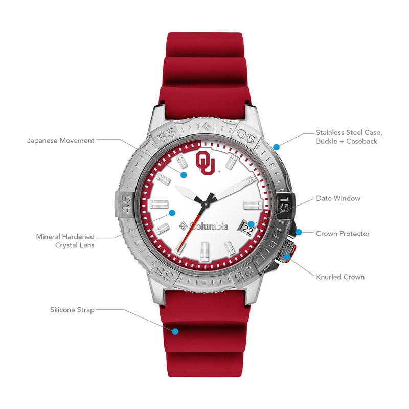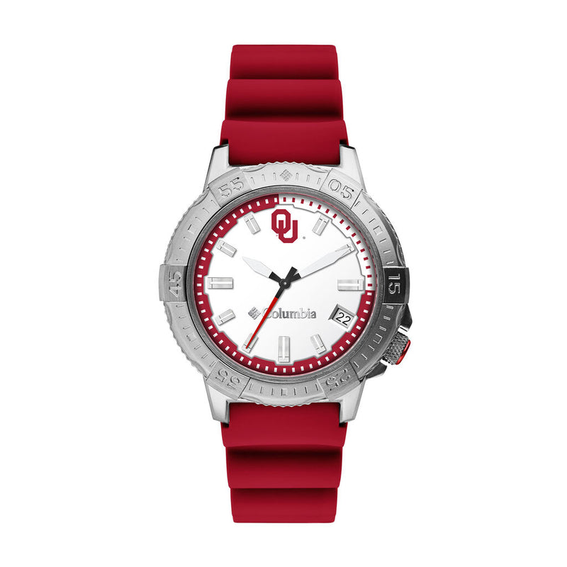 From the Columbia Collegiate collection, this Peak Patrol style University of Oklahoma watch features a white dial with silver-toned hands and markers, a date display at the four o'clock hour and red accents with mineral crystal in a 42.0mm stainless steel case. The reliable quartz movement keeps you right on time. The red silicone strap, with ribbed detailing, secures with a buckle clasp. Water-resistant to 50 meters