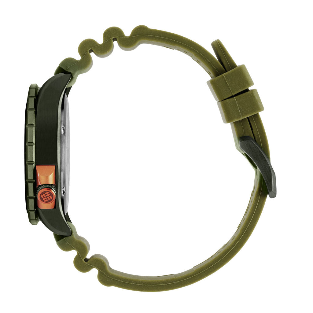 The case’s diameter measures at 42mm and it is made of stainless steel, in order to increase the longevity of the watch. The green bezel is unidirectional and it features numeral markings that function as an additional time-keeping aid. It also features a knurled crown that is situated at the 4 o’clock marks. Knurled crowns are also used on the widely respected Seiko SKX divers.