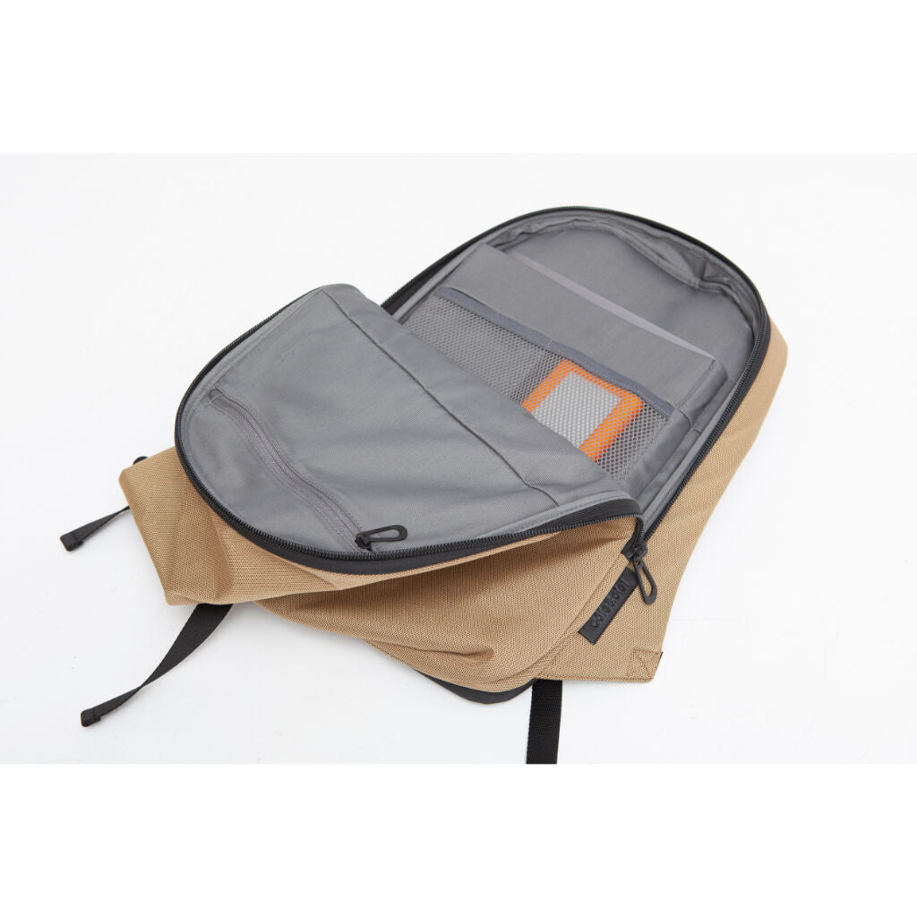 The body of the Isar rucksack is made out of a lightweight water repellent coated canvas with additional detailing. The bag’s minimalist exterior is complemented by a contrasting inner compartment and lining.