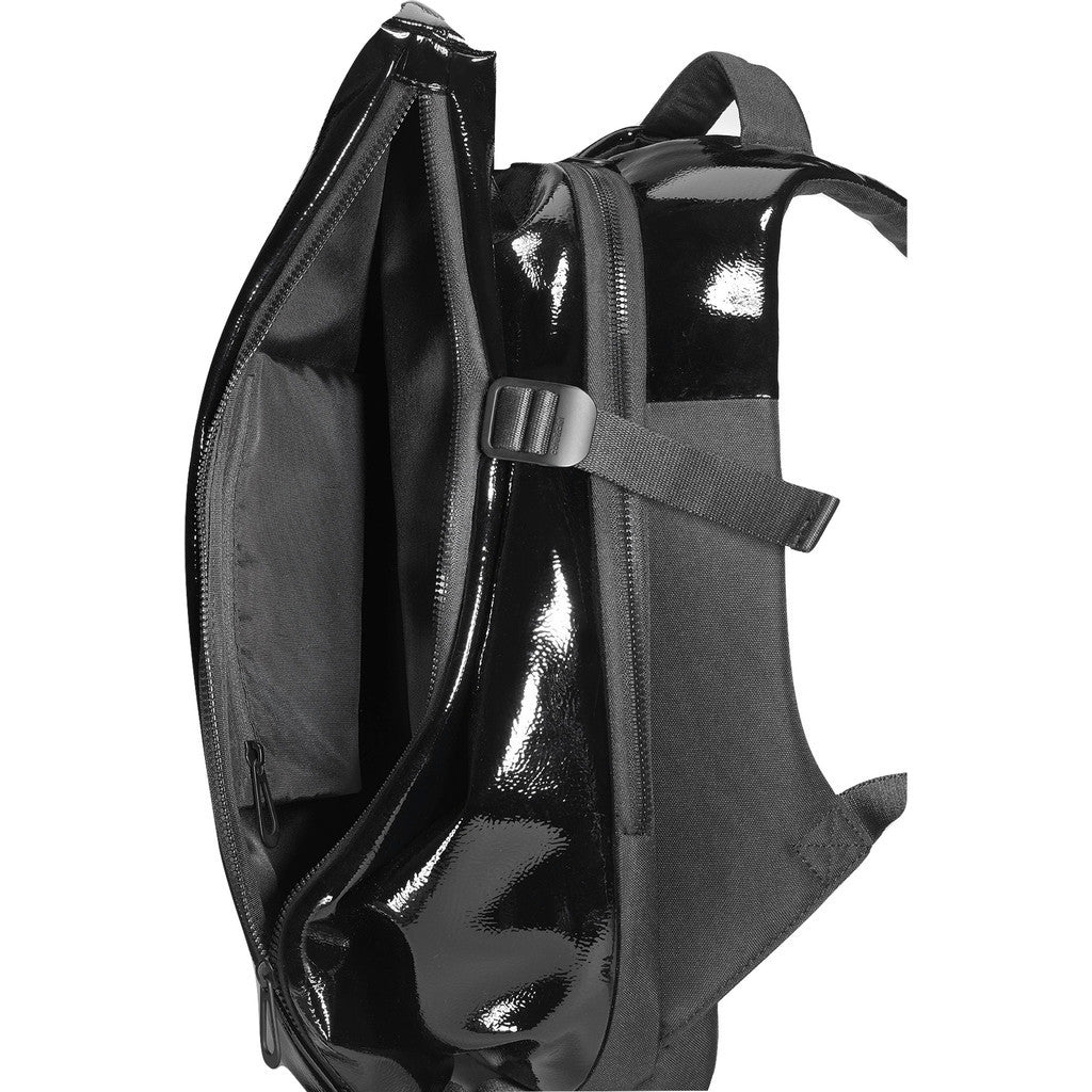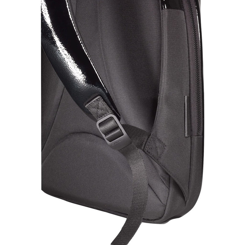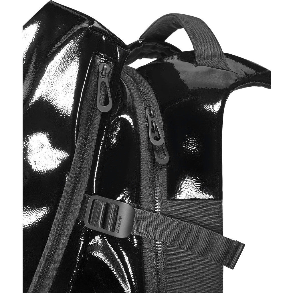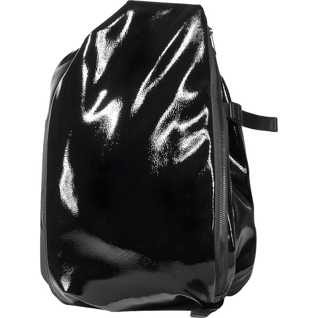 The Cote et Ciel Isar Rucksack in Liquid Black embodies their iconic style with flowing lines and unassuming functionality. Seemingly more of a sculpture than a backpack, the unusual shape is an exercise in ostentatious forward thinking and progressive design. The Isar Backpack is for those daily commuters looking for functionality while making a fashion forward statement. Made with Laquered Polymer, this pack features a front compartment with a pocket for valuables and compression straps to organize your belongings. The separate back compartment of the backpack has a padded laptop pocket that protects your devices up to 17", with mesh pockets that have space for your daily carry.