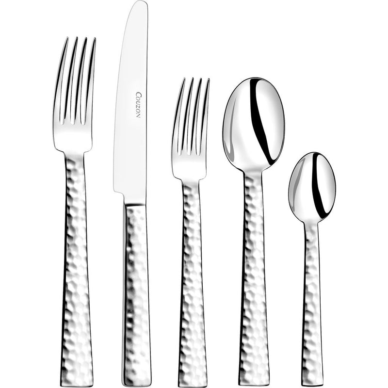 An elegant European style tableware set from Couzon crafted using stainless steel and complete with delicate hammered handles. This tasteful collection includes a table knife, table fork, teaspoon, desert fork, and desert spoon.