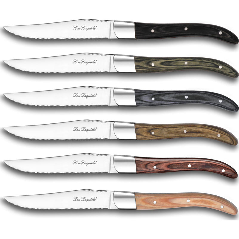 The Lou Laguiole Steak Knife Set breaks the mold of traditional tableware with full tang, stainless steel blades and elegant, ergonomically shaped real-wood handles. Carefully conceived by French desinger Jean Couzon; this steak knife set comes complete in a wooden storage box and features pakka wood in the assorted handles.