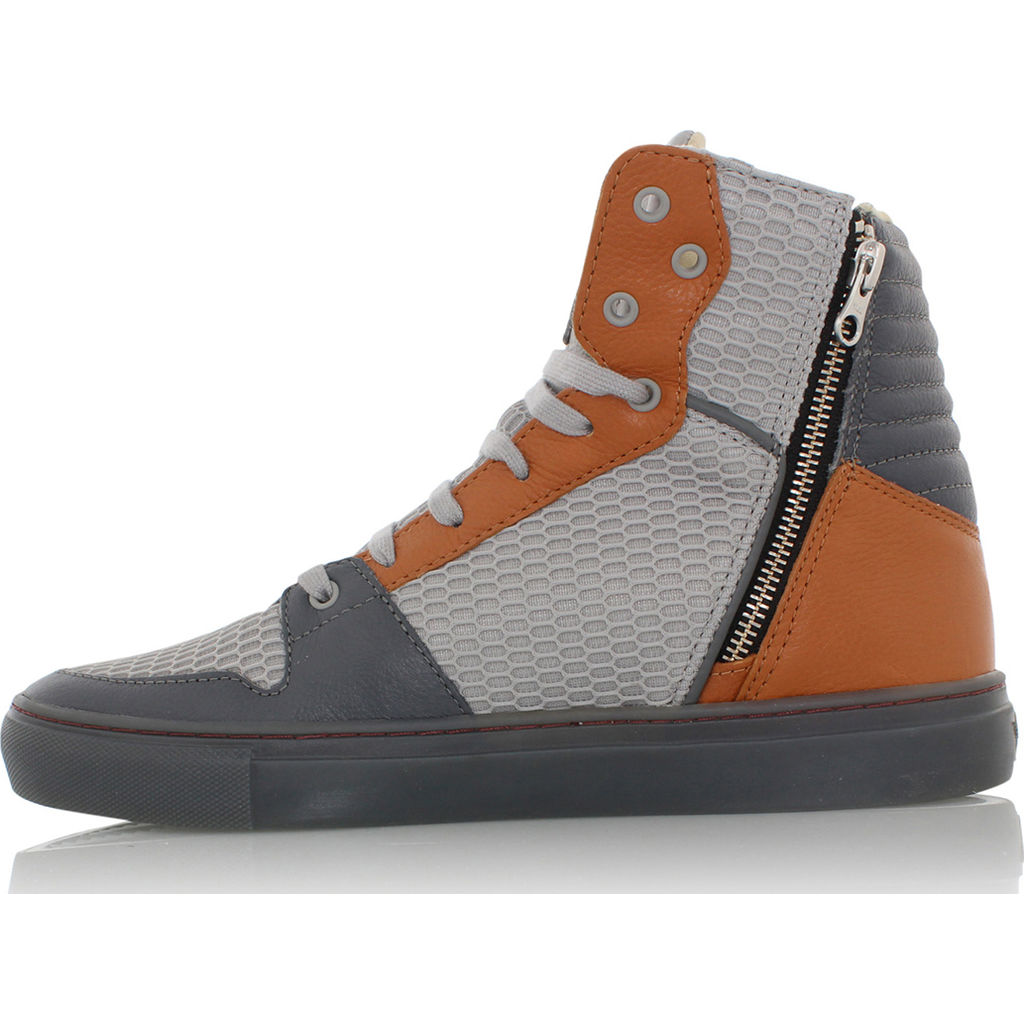 Creative Recreation creates sleek and unique designs for comfortable and stylish usage no matter your style. This casual Gray, Black, and Orange high-top sneaker offers a padded tongue and top heel counter, with stitching lines that form rows of padding for maximum comfort as well as a sleek style. A slanted vertical zipper makes them easy to slip on and keeps them snugly secured for any use. The interchange of light and dark makes for a refined and understated design that complements almost any outfit and is great for day and night.