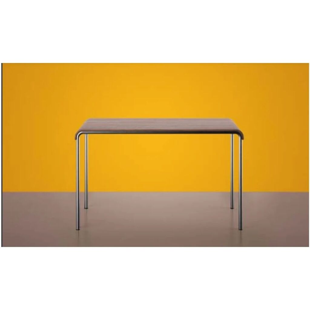 Farallon Desk is a extremely light but resistant table. The structural principle takes up the shapes and technologies of the Farallon family: a thin metal surface harmoniously curved in order to follow the shapes of the soft surfaces. The legs are chrome bars.