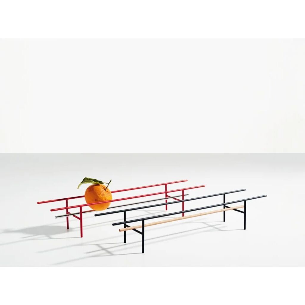 Fruit bowl no 5.5 can technically be described as a “container” thanks to just a few essential elements – three horizontal bars on two sets of legs. The idea is to hold the fruit in a seemingly unstable way, showing the precariousness of nature.