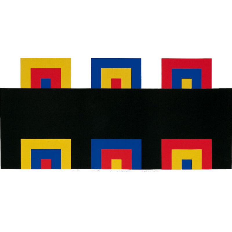 Le Porte is a four-colour silkscreen print. The relationship between colour and volume shows a transition from real space to abstraction. The sequence of coloured shapes gives volume to the space depicted.