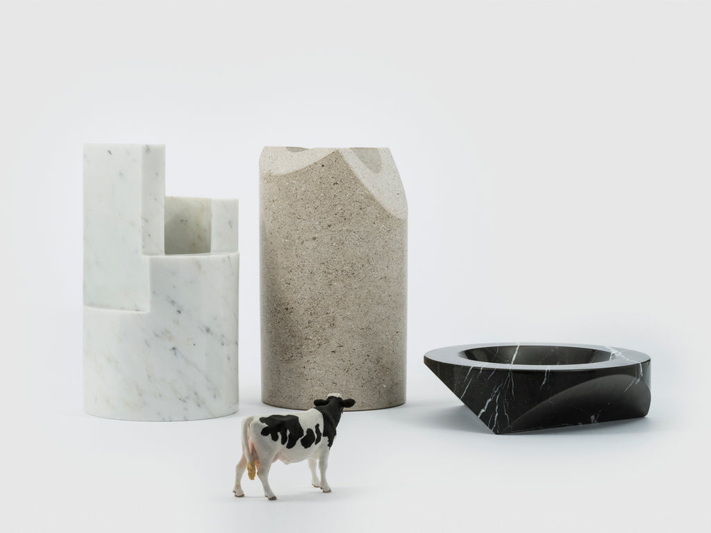 Paros H is a sculptural vase made from veined Calacatta marble in a limited edition of 100 pieces per year.