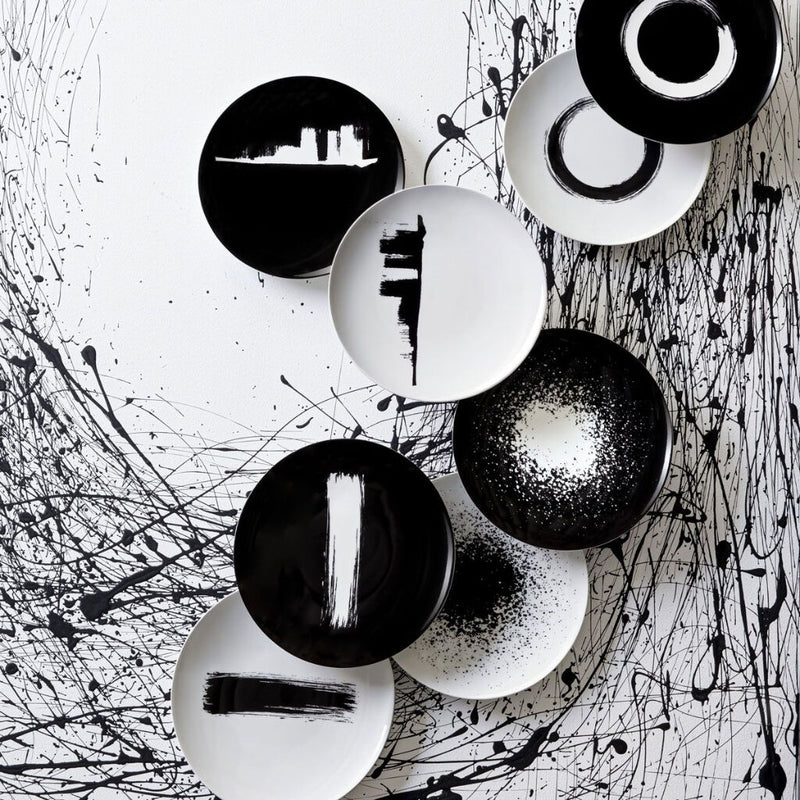 The ARTY CREATION gift box is composed of 6 round plates 20cm with the decors dripping", "circle", "skyline". It invites you to create a presentation of your dish like a chef."
