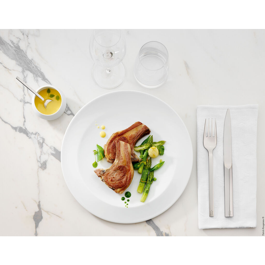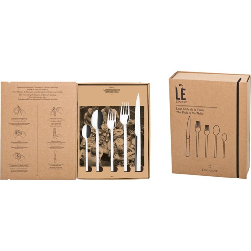 The partnership between Degrenne and Starck did not stop there. Since a love of food does not end in the kitchen, Starck has developed L'E Starck, a collection of cutlery based on L'Econome BY Starck range. Inspired by the sculpted handles of the kitchen tools, this cutlery collection draws a natural link between kitchen and plate, preparation and consumption. The stainless steel range boats a pared-down look. The frok and spoons with their concave design allow you to eat grain food (quinoa, rice, lentils etc…) or sauces. A sharp, elegant blade emerges from one end of single piece knife with its oval extruded handle. When laid on its edge, it provides an orginal way of setting your table.