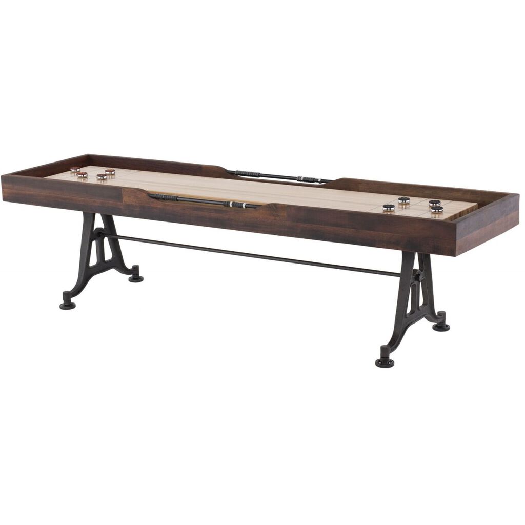 The District Eight shuffleboard table adheres to the design philosophy behind the Lusine Industrial collection, combining classic French factory industrialism with a pared-down modernist aesthetic. Striking and resilient, the shuffleboard table features a pedestal base rendered from reclaimed cast iron machine parts with a top constructed from reclaimed hardwood, recycled from renovated colonial-era bridges, factories, and warehouses in Vietnam. The game board is laminated with North American oak and has a high durability lacquer finish.