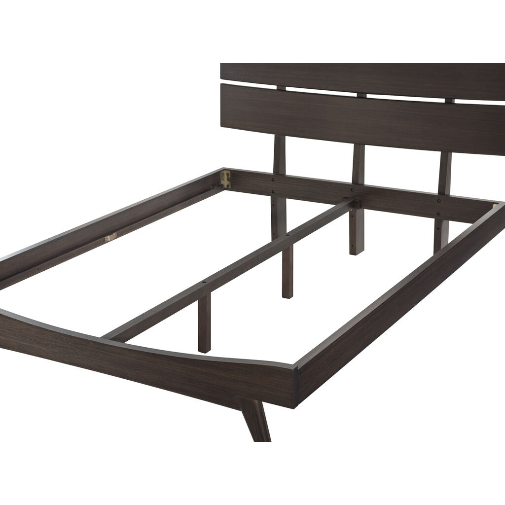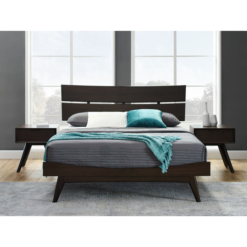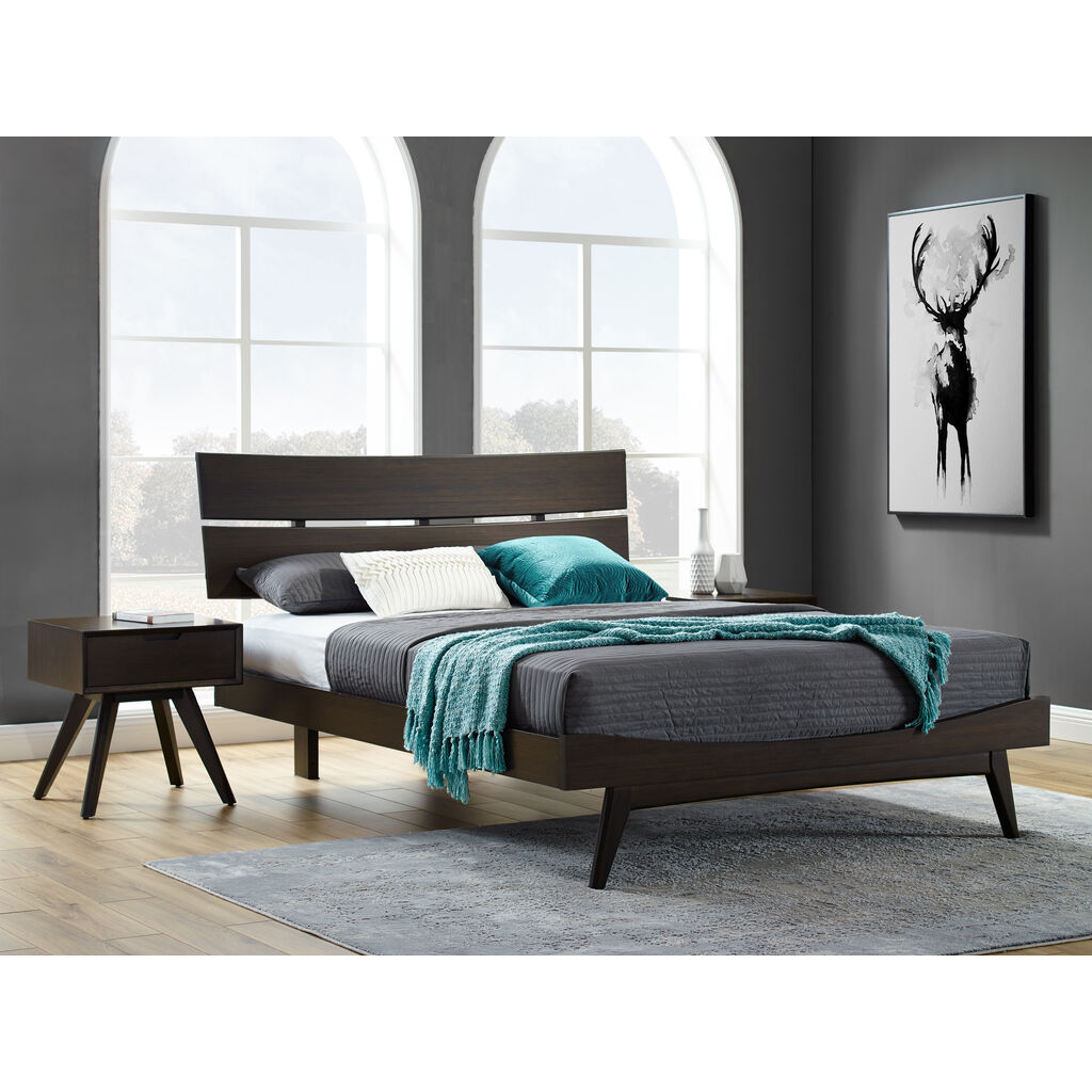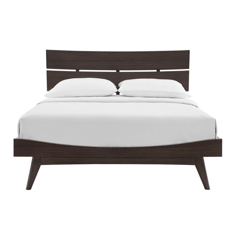 Beautifully crafted in bamboo, the elegant Summit platform bed features a sweeping silhouette, elegantly sculpted details, and contemporary splayed legs. The Summit bed is beautifully hand-finished with a rich Havana stain to enhance the natural grain in the surface of the bamboo, and pairs perfectly with the Vale chests to create a transitional collection that compliments any style. Designed for use with a mattress only, the Summit platform bed is supported with a hat compliments any style. Designed for use with a mattress only, the Summit platform bed is supported with a European slat system, eliminating the need for a box spring. Made in an ISO 14001 Environment Management certified facility, your purchase of this environmentally friendly bamboo product helps support forests and ecosystems worldwide.