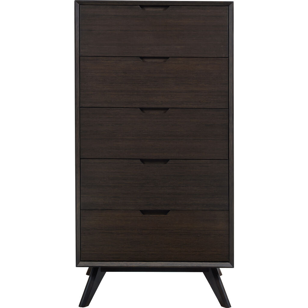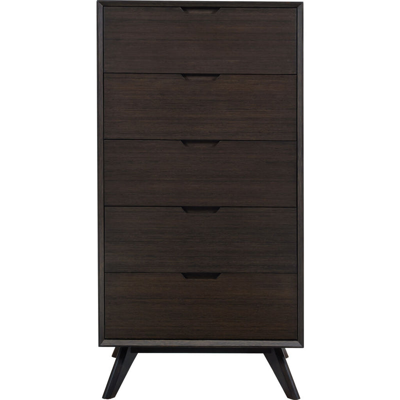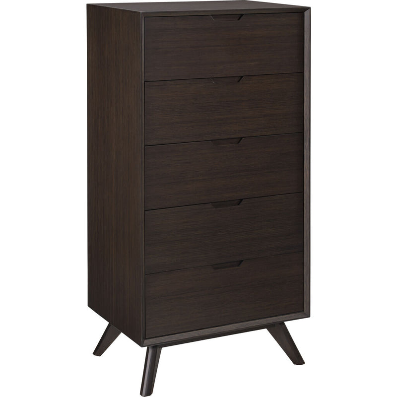 The Vale five drawer high chest is craftsman built using sustainable bamboo, and beautifully hand-finished with a rich Havana stain to enhance the natural grain in the surface of the bamboo. Each drawer in the Vale collection features a subtle recessed drawer pull and is crafted using engineered plywood with a drawer face of solid bamboo. Solid, strong and crafted for a lifetime of use, the contemporary Vale high chest is shipped professionally assembled.