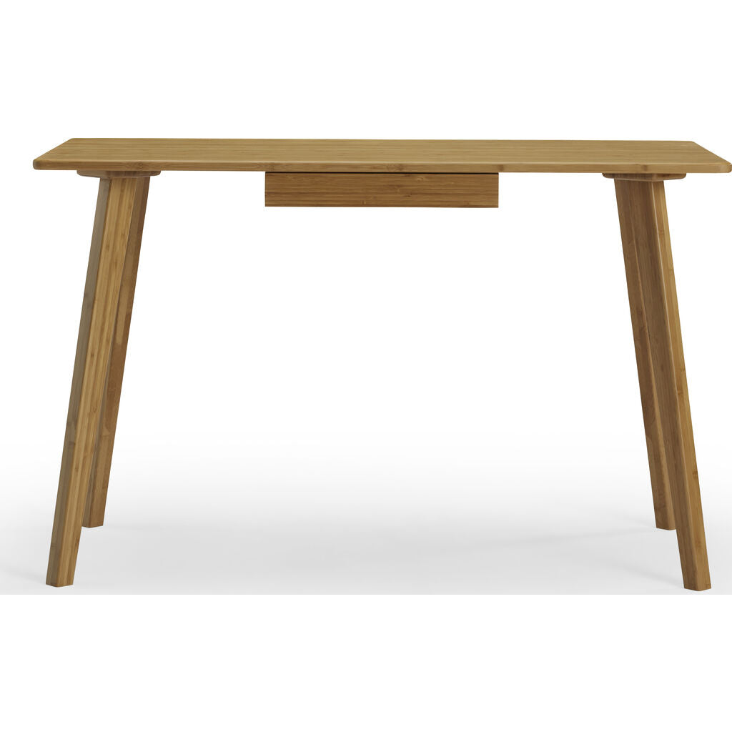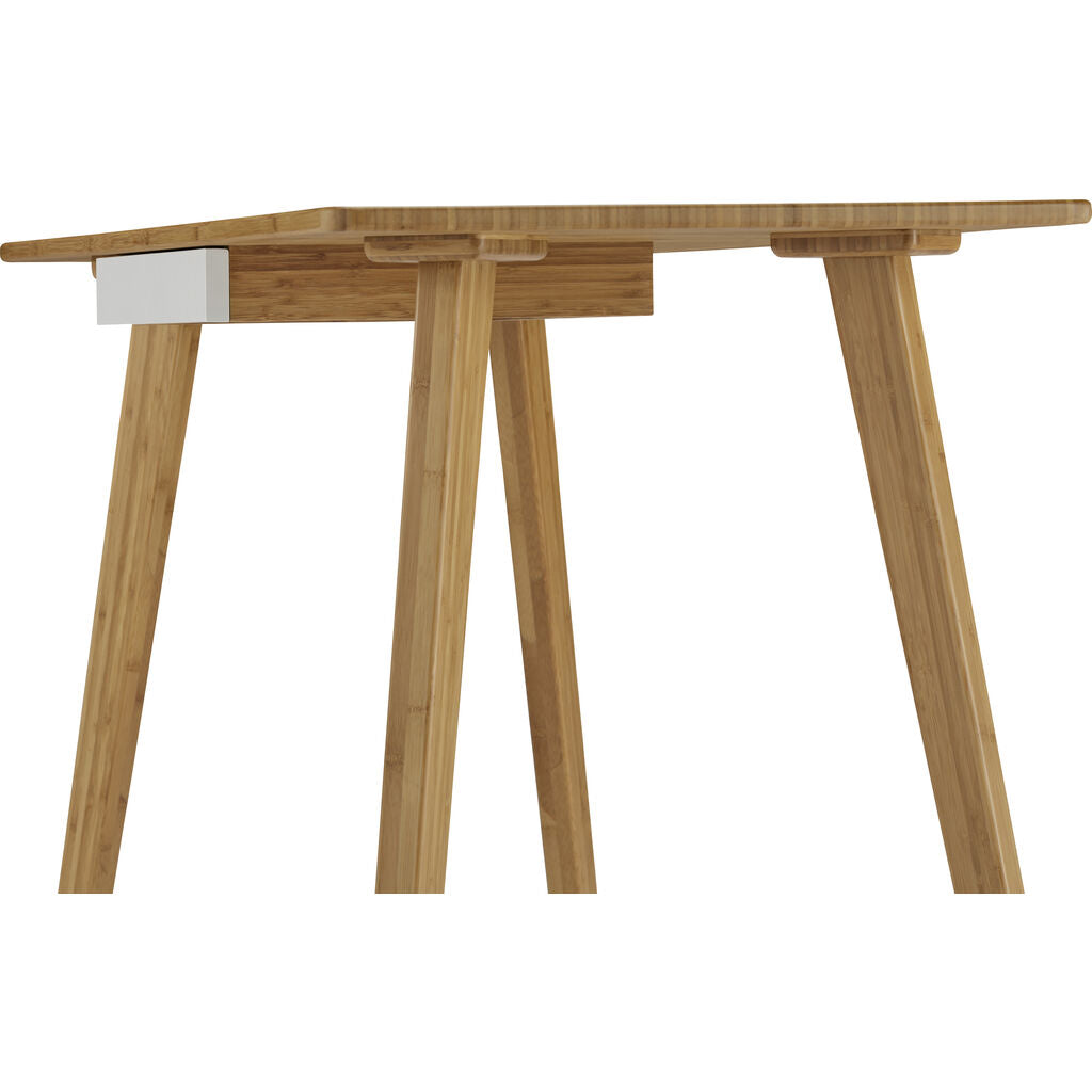 A perfect small space solution, the Vista writing desk takes its cues from mid-century design. The sleek silhouette, tapered angled legs and the rich grain of caramelized bamboo creates a modern look for your home. Tucked underneath the generous work surface is a slim center pencil drawer, shipped with two interchangeable drawer faces. Your choice of bright white or solid bamboo. The Vista writing desk is beautifully finished on all four sides and built to perfection from earth friendly solid bamboo.