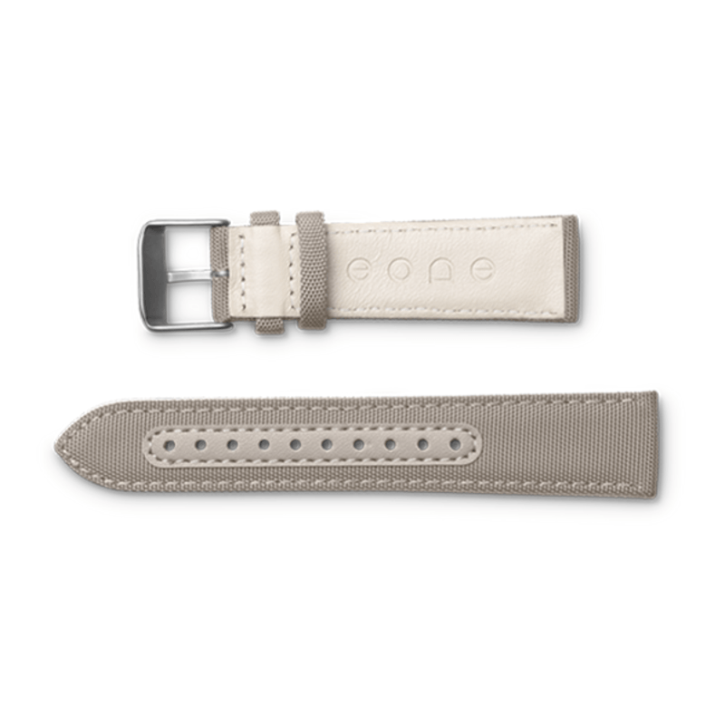The Eone Wristband for the Bradley Classic features a dyed canvas accented with leather reinforcements of the same color along the punched holes. On the interior the nude, soft leather is embossed with the Eone logo. The canvas and leather wristband can be interchanged with the stainless steel mesh wristband on any Bradley Classic Timepiece.