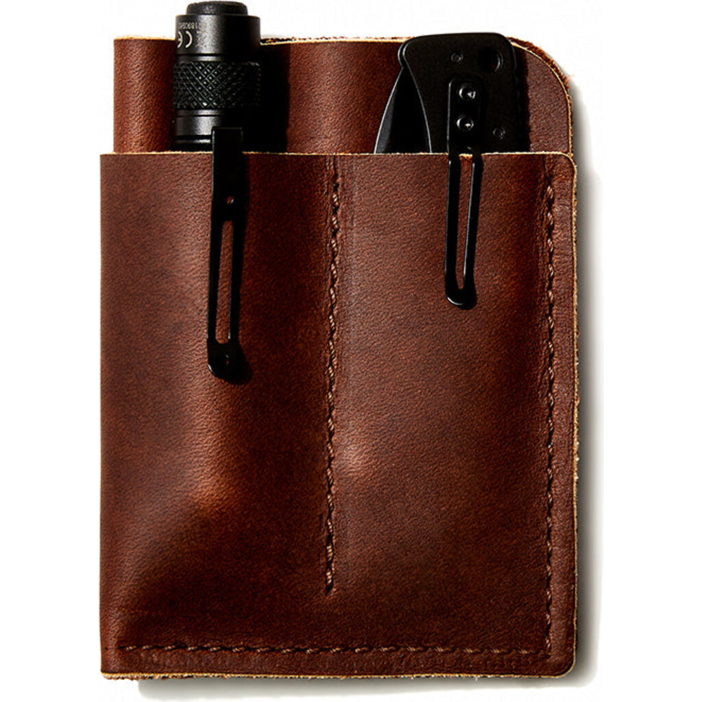 Made from full-grain leather sourced from S.B. Foot Tannery in Minnesota this functional piece is a utilitarian upgrade on a standard cardholder. It’s got a roomy middle pocket for folded cash and a back pocket for cards, with two pouch pockets on the front meant for a pocket knife and a small flashlight — or any other small accessories you want to keep with you.