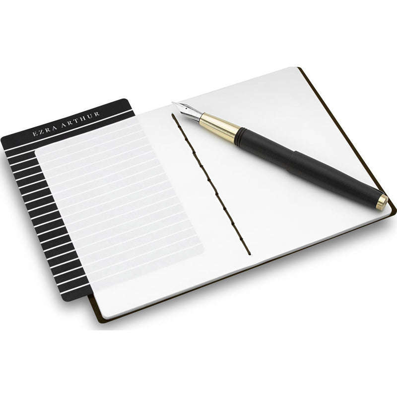 Ezra Arthur is the only destination for specialty handcrafted lifestyle products made with exceptional care and selectively chosen and tested American-sourced materials. It has a multitude of names: notebook, sketch pad, journal, diary, ledger, logbook, or address book. Whatever you call it; the Small Jet Black Notebook by Ezra Arthur is the accessory you've been searching for. Hand stitched and bound in premium Horween leather, this elegant little book is filled with 128 pages of Tomoe River Paper. Tomoe River Paper has been widely accepted as the highest quality writing paper, for various writing instruments, thanks to its ultra thin profile, smooth texture, and resistance to bleeding through.