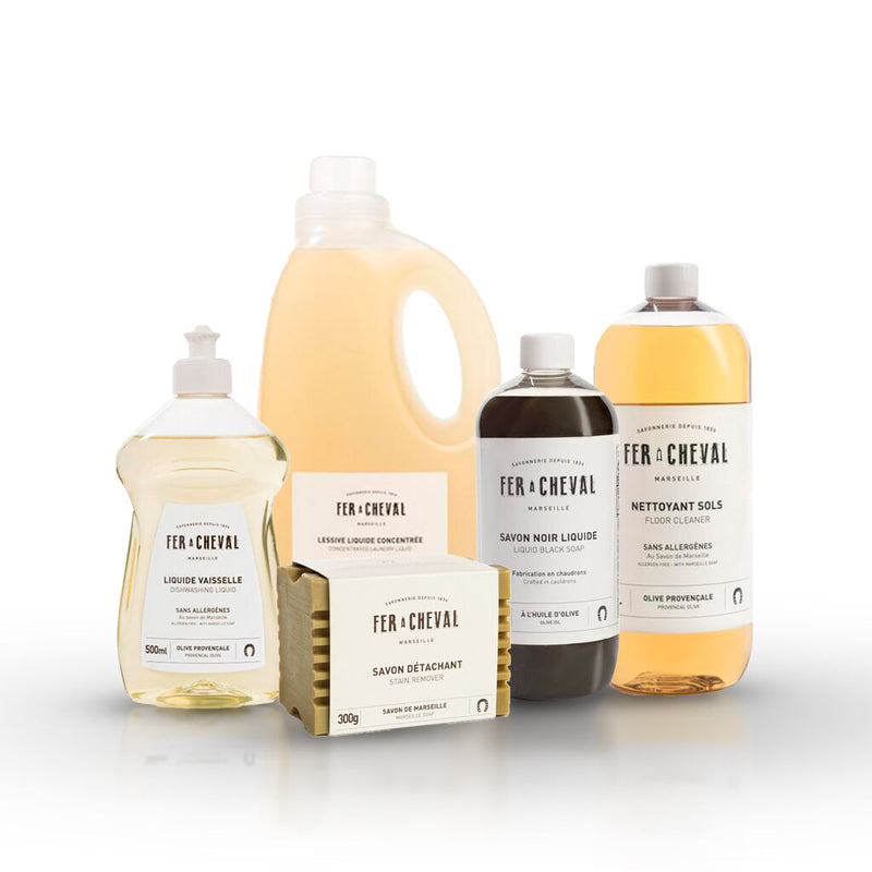 This Sportique exclusive bundle is a curated set of elegantly crafted cleaning products for your home. It includes some incredibly enticing offers from the world renowned French soap manufacturer Fer à Cheval. Within this set is Fer à Cheval's liquid black soap (1L), dishwashing soap (500ml), floor cleaner soap (1 liter), stain removing soap bar (300g), and their concentrated liquid laundry soap. The five essential items to keep your home as beautiful and clean as you are.