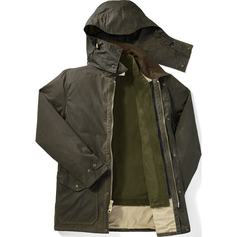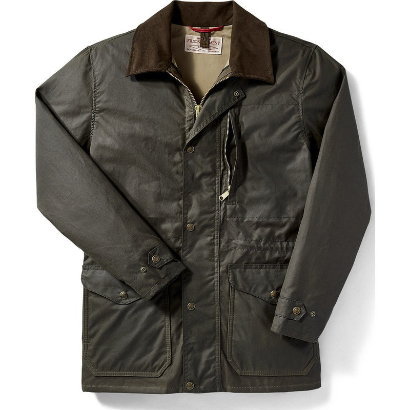 The Filson Cloth Mile Marker Coat in otter green is the ideal coat for those cold winter months. It is weather-resistant while remaining lightweight and breathable to keep up with you while you're on the go. This fully-lined coat is designed to be functional with minimal bulk, meaning it insulates without weighing you down. The Moleskin-lined collar is designed to be comfortable around your neck and face while keeping out the wind, rain, and cold.