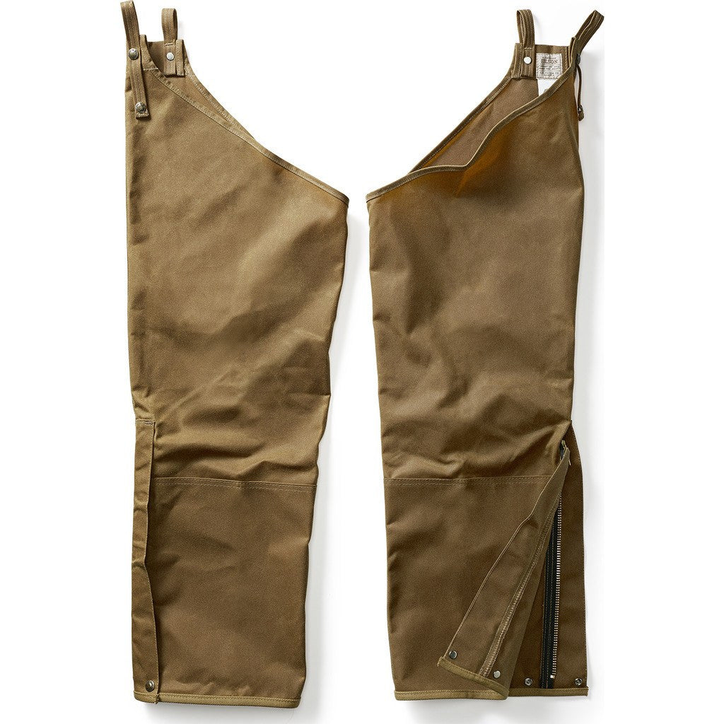 These Tin Pants provide a double layer of Filson's oil finish Tin Cloth, renowned for its toughness, durability and longevity. Flat felled seams, bar tacking at points that handle the most stress, double-needled craftsmanship and binding made of Rugged Twill ensure these aren't your average chaps: they're built for years of use and stress. Other features include adjustable side straps and a custom cut, 14" brass zipper with a storm flap great for sliding over boots.