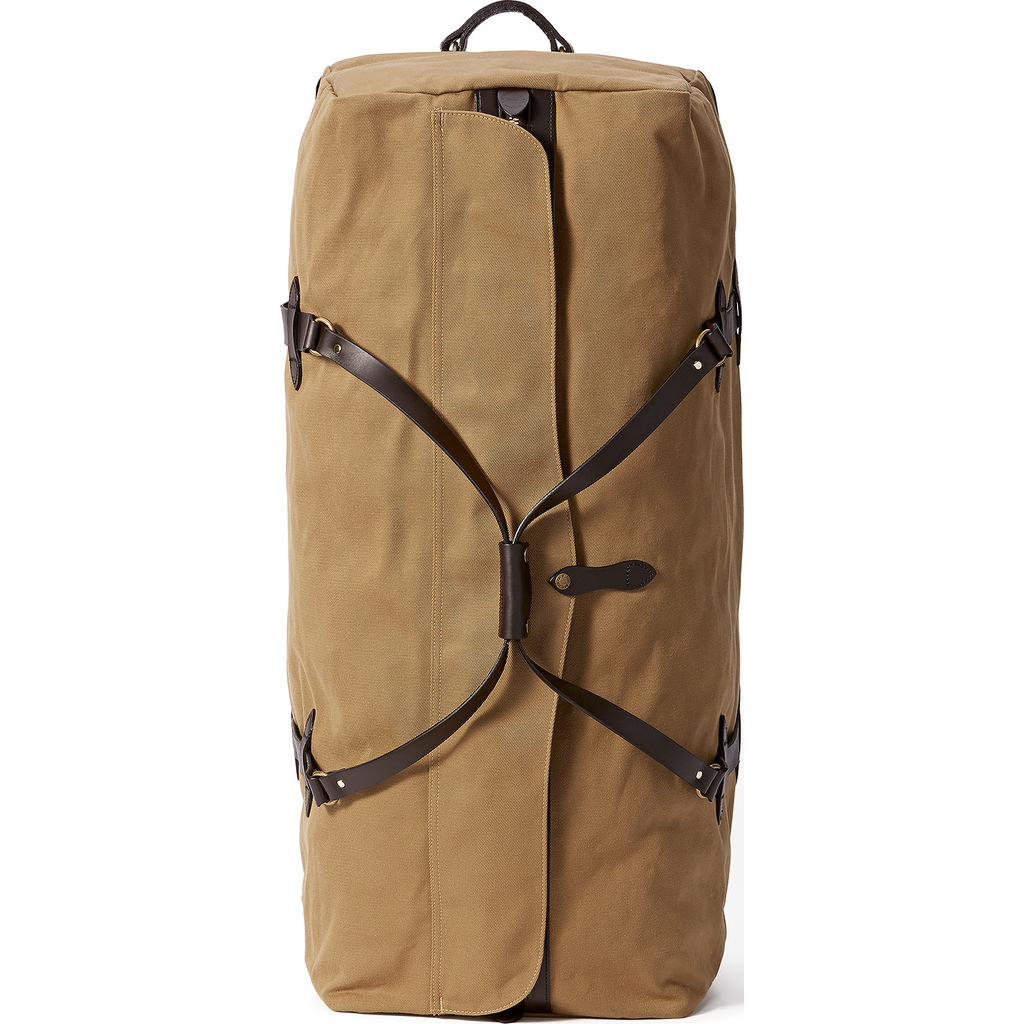 Looking for a heavy duty travel bag? The Filson Tan Extra Large Duffel has a huge capacity and is as durable as they come. Made with rugged twill and Bridle leather accents, you will get use out of this bag for years to come. This duffle is designed with stabilizing aluminum rails, a wide wheel base and two wide ball-bearing wheel to prevent it from catching on curbs. Their are two roomy interior pockets to help keep you organized on your adventure.