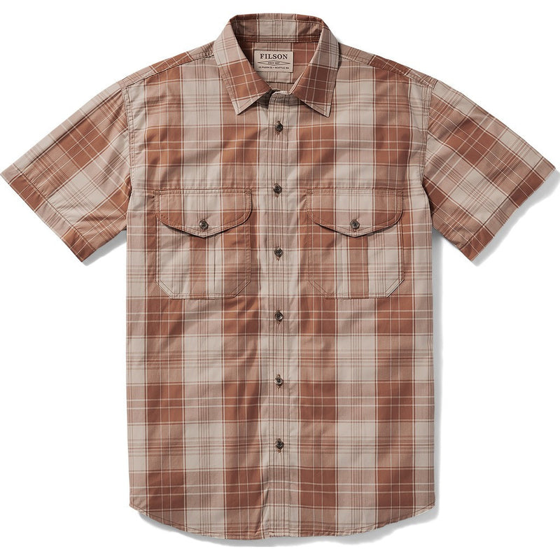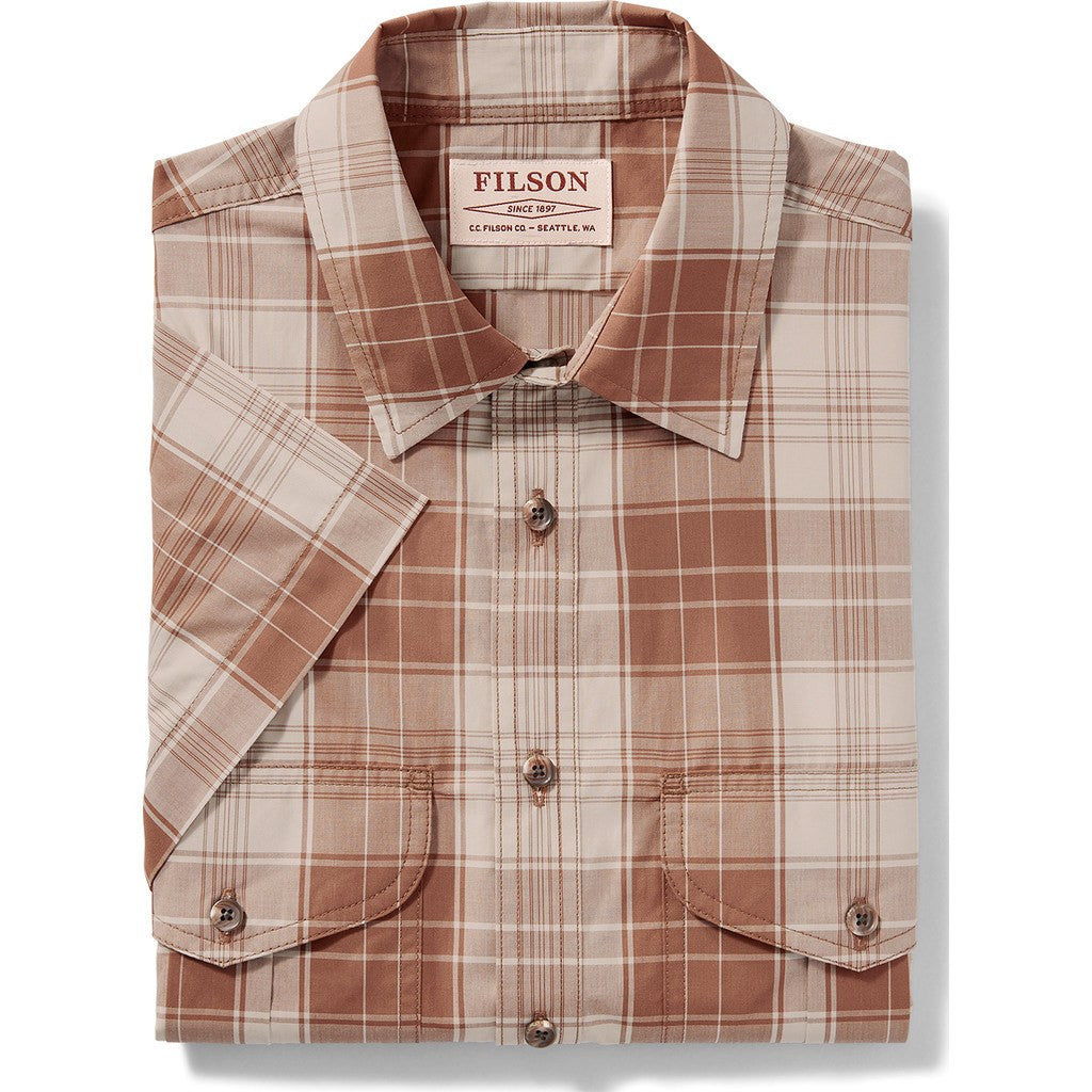 This Feather Cloth Shirt in brown/cream plaid is Filson's most lightweight offering, its ultra-slim design making it perfect for packing and traveling. Crafted from cotton that's breathable and pre-washed so it won't shrink significantly, the pleated back also gives exceptional flexibility and maneuverability when wearing. Double-needle construction ensures you're dealing with Filson's famous durability and longevity. This shirt will become a treasure of your wardrobe.