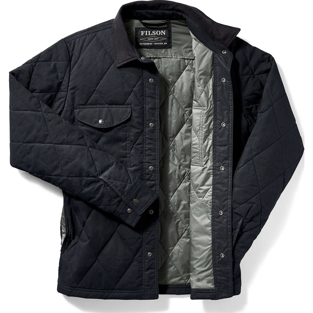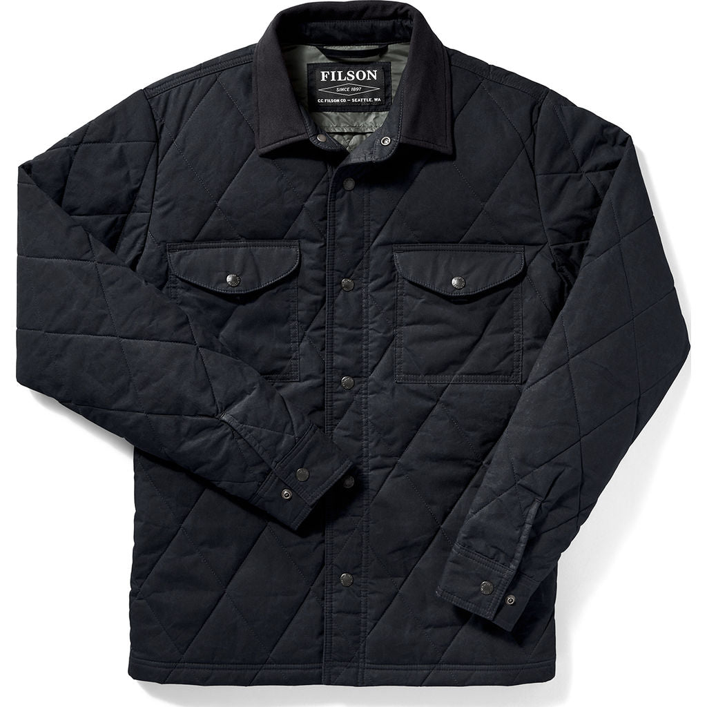 The Filson Hyder Quilted Jac-Shirt in Faded Navy is the perfect water-repellent work shirt that can be worn in every season. The Hyder Quilted offers the weight of a shirt with the water-resistant performance of a jacket. This shirt is equipped with a midweight 4-oz. cotton shell and a special dry wax coating which holds back the rain, keeping you warm and dry. Filson has engineered thee Hyder Quilted Jac-Shirt with a snap-close front to be easily operated while wearing gloves.