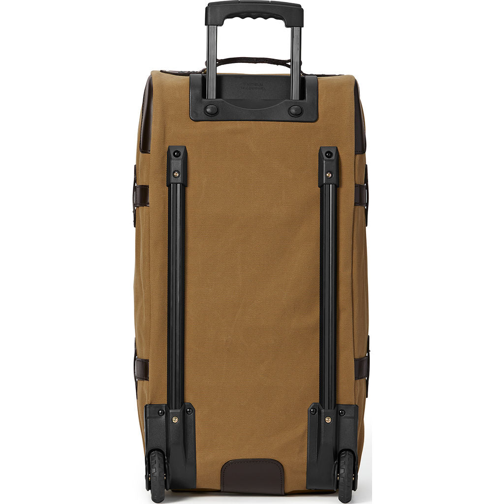 Filson has a long standing reputation for their high quality heavy-duty travel bags. The Tan Large Rolling Duffel has a huge capacity and is as durable as they come. Made with rugged twill and Bridle leather accents, you will get use out of this bag for years to come. This duffle is made with water resistant and abrasion resistant materials so it is sure to last for decades of adventures. Their are two roomy interior pockets to help keep you organized on your travels. Solid brass zipper closure custom cut at Filson with leather snap-tab storm flap for added security.
