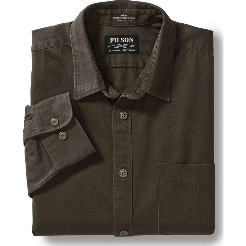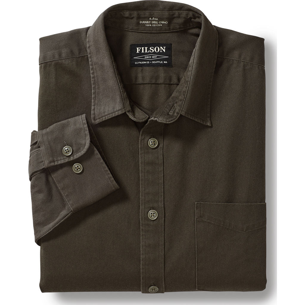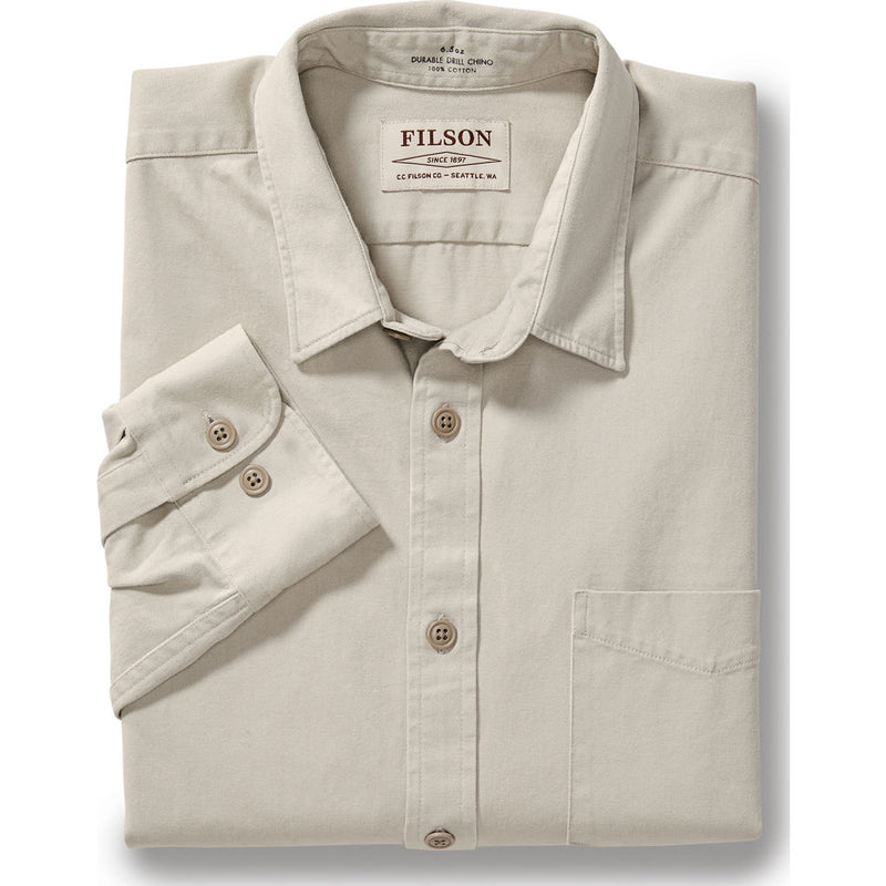 The Mens 6.5 oz Chino Long Sleeve Shirt is ideal for everyday wear. This long sleeve button up is made of a midweight cotton that is a tightly woven twill for long lasting abrasion resistance. Featuring chip-resistant, military-grade melamine buttons on the front and cuffs. Available in Light Gravel and Wetland Brown.