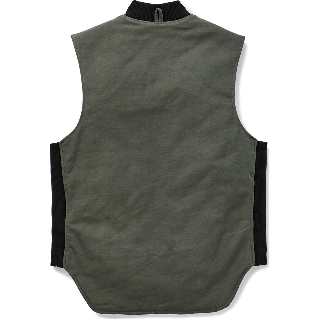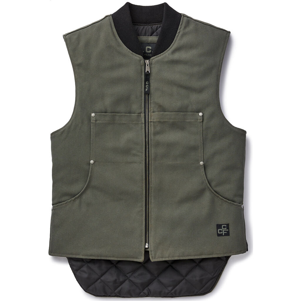 Filson C.C.F. Work Vest is made of rugged duck canvas and warm diamond-quilted insulation. Triple-stitched seams and reinforcing rivets hold up to heavy use. Drop tail for added coverage in the back. The secured inner pocket is sized to hold an iPhone Plus while front access is perfect for grab-and-go items like pens or earplugs in the shop or your compass when navigating the outdoors.