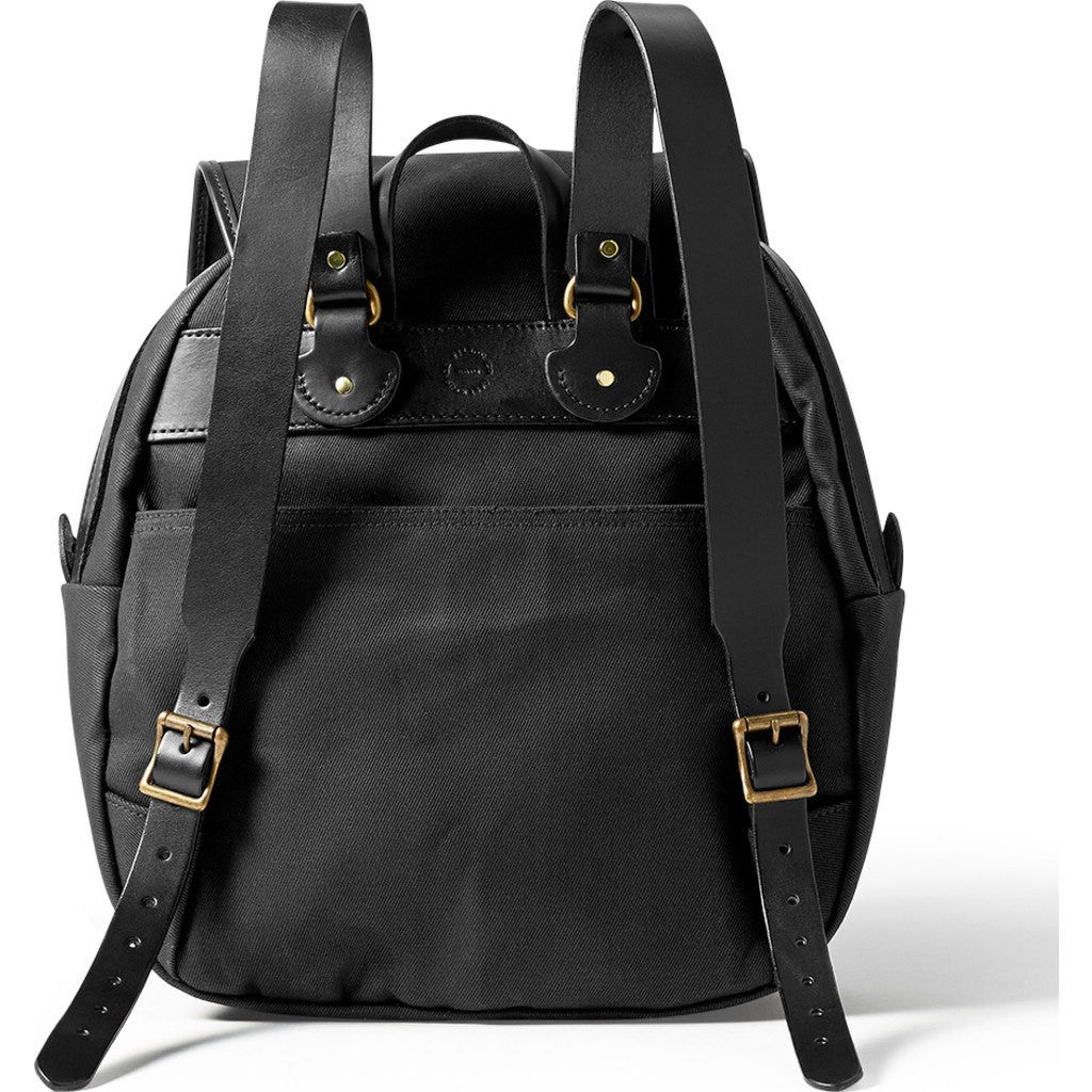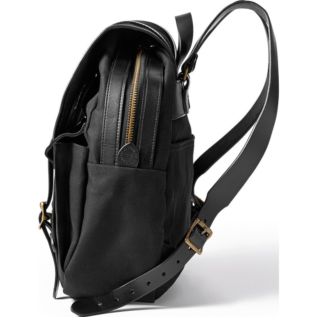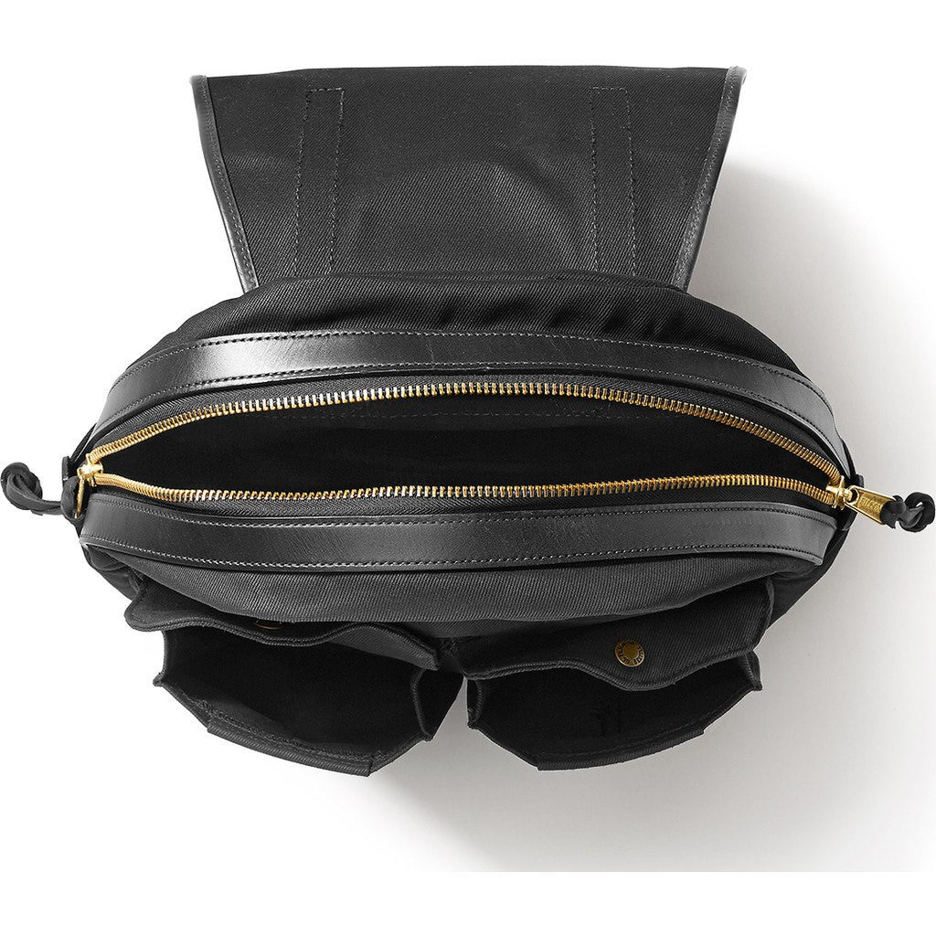 - Solid brass zipper closure custom cut at Filson with storm flap for added security