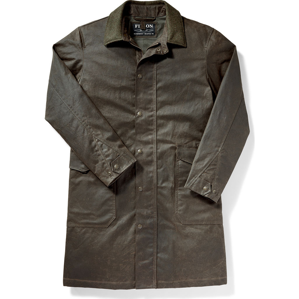 Filson's olive brown trench coat is crafted from waxed cotton, making it repellent to water and resistant to wind. This coat's three quarter length traps in additional body heat that is wasted with shorter cuts, while a pleated back offers a full range of motion. Complete with soft cloth lining throughout the body and wool lining around the neck, Filson's trench coat is for the man who can't be slowed down by bad weather.