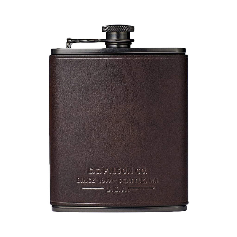 Keep your spirits up with Filson's Trusty Flask. With a generous 6-oz. capacity, it's made in the USA from food-grade stainless steel and wrapped in vegetable-tanned harness leather from Wickett & Craig in Pennsylvania. Outfitted with a leakproof lid, you won't waste a drop.
