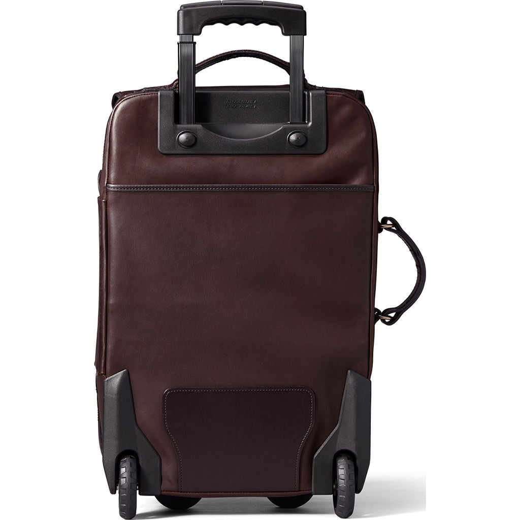 Filson upscale designs with their years of expertise in materials makes the Sierra Brown Rolling Carry-On Leather suitcase ultimate stylish bag. The weatherproof carry-on is made with a proprietary leather that’s vegetable-tanned by Wickett & Craig, the 150-year-old Pennsylvania tannery that makes our Bridle Leather. This special boot-grade leather was formulated to be weather- and salt water-resistant, then added solid brass hardware and genuine Bridle Leather straps and reinforcements. Sized to fit into overhead compartments in major airlines, this rolling suitcase features molded feet, a 20” retractable handle and heavy-duty wheels to keep up on long adventures.