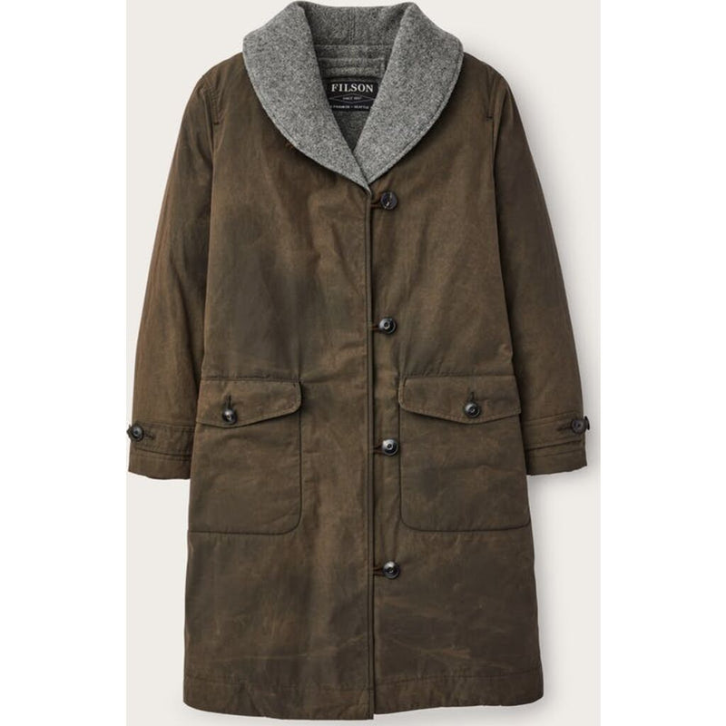 When the weather takes a turn for the worse, the Filson Women's Wool Lined Trench Coat has you covered with a knee-length cut and water-resistant Aero Finish dry-wax treated shell construction. Lined in 16.5-oz. military blanket wool with 100g Thinsulate® lined arms, it offers effective insulation. Features a short shawl collar, buffalo horn buttons, and an interior security pocket.