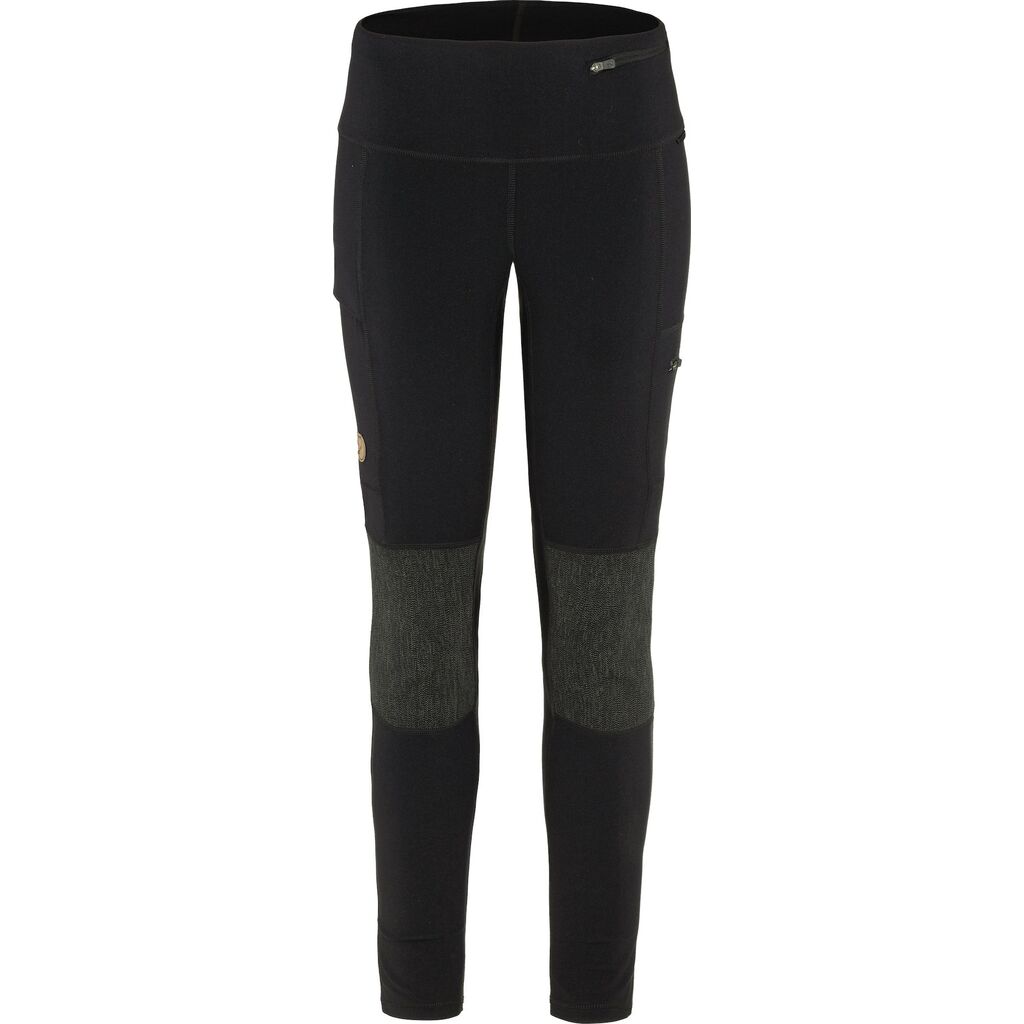 Technical and durable trekking tights in a highly functional stretch fabric. They combine the freedom of movement of tights with the durability of a pair of trekking trousers; reinforcements over the rear and knees can handle close contact with sharp stones and rocks and also resist moisture if you sit or kneel on damp ground. Perfect for all kinds of trekking in the mountains and other rough terrain. Practical leg pockets offer practical storage; a large one on the right-hand leg has room for a map and a smaller zippered one on the left-hand leg fits a compass. The waist is wide for better comfort and can be adjusted with a drawcord on the inside. There is also a zippered security pocket and a little loop on the left hip to attach gear or a light jacket to.