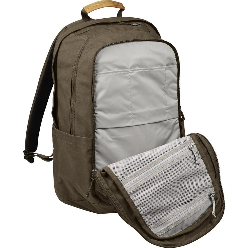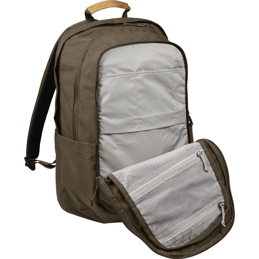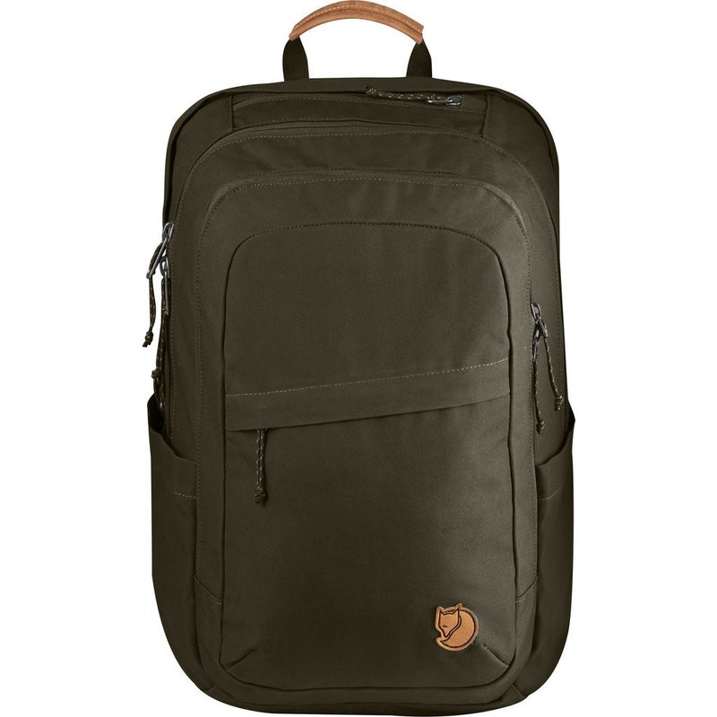 Fjallraven uses innovative materials to craft outdoor packs with ultimate functionality. The Dark Olive Raven Backpack is constructed with G-1000 Heavy Duty Eco material. The 28L Raven features a padded laptop compartment, a sunglasses pocket, a front zip pocket, leather top carry handle, two side pockets and padded shoulder straps. Whether you're heading to school, work or an overnight trip, this pack is perfect for any adventure.