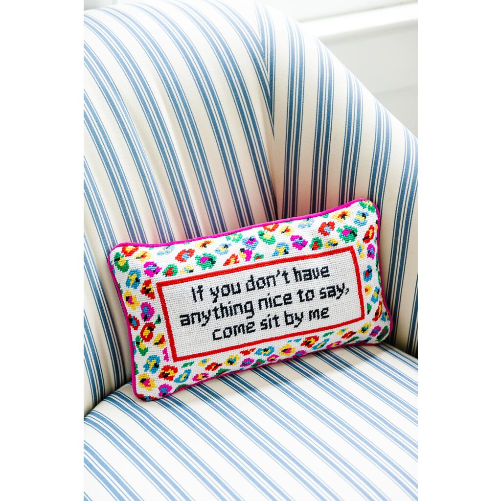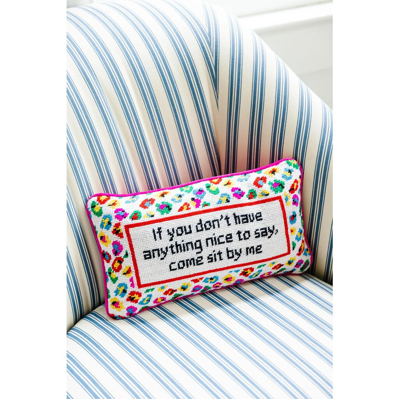 Furbish presents a rectangle-shaped Come Sit By Me Needlepoint pillow that features an “If you don't have anything nice to say, come sit by me” statement printed pillow with a luxurious and beautiful design that brings a classic look to your home decoration. This is handmade and embroidered in 100% wool and backed by 100% cotton in luxe pink velvet. Make a statement with this charming-meets-chic needlepoint pillow. Hand embroidered in wool and backed in luxe pink velvet, we've revived this Southern staple with sayings that are sure to get a smile. This small pillow measures 9" x 15" with a big statement. Each of our needlepoint pillows takes approximately 20 hours to hand stitch creating a very unique and special accessory for your home. This pillow suits living rooms, dining rooms, sofas, couches, chairs, coffee shops, and more. It also will be an excellent gift for friends, families, or your loved ones.