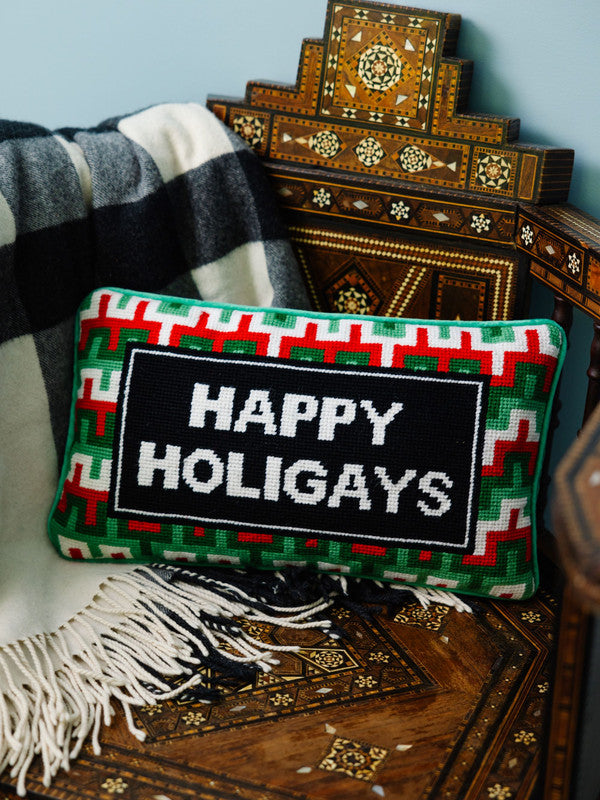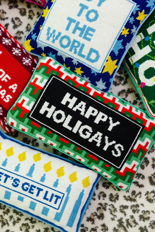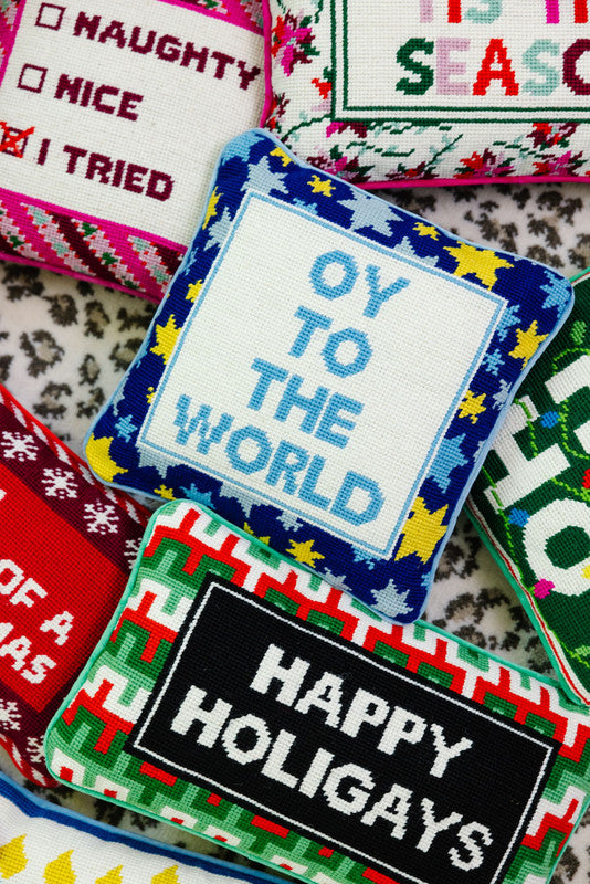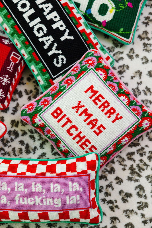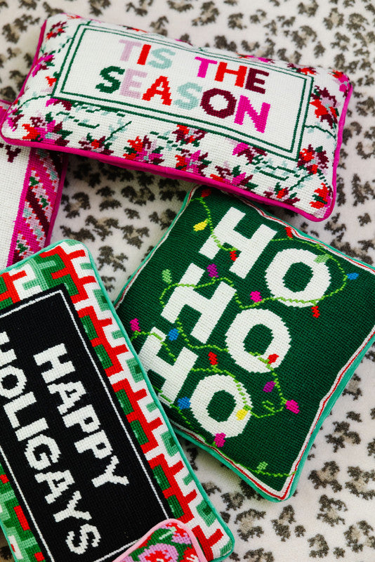 Add a dash of irreverent holiday cheer to your home with our collection of charming-meets-chic needlepoint pillows, each featuring playful sayings that are sure to spark joy and get a smile. Hand-embroidered in wool and backed in luxurious velvet, these small yet statement-making pillows, available in various festive colors and sizes (ranging from 8" x 14" to 11" x 11"), take approximately 20 hours to craft, making each one a unique and special accessory for your holiday décor. Perfect for gifting or adding a touch of humor to your festive space, these pillows blend traditional craftsmanship with contemporary wit, ensuring a merry and bright season with a twist.