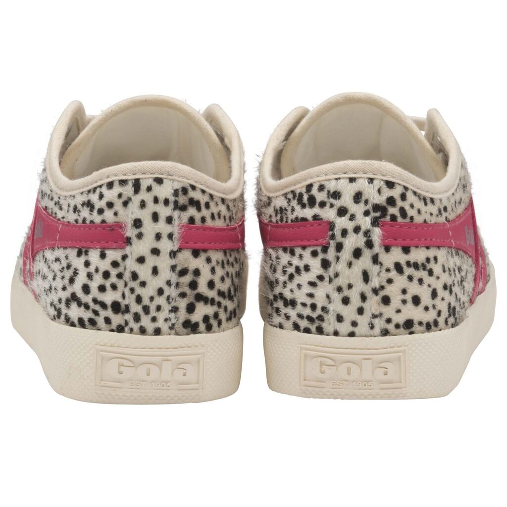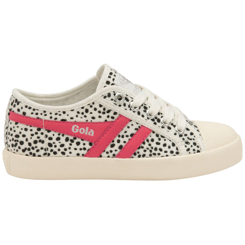 Gola Coaster Cheetah for kids features a fun cheetah print on this classic Coaster plimsoll. The off white upper combines with color pop fluro pink highlights to make a great summer kid's wardrobe essential trainer.