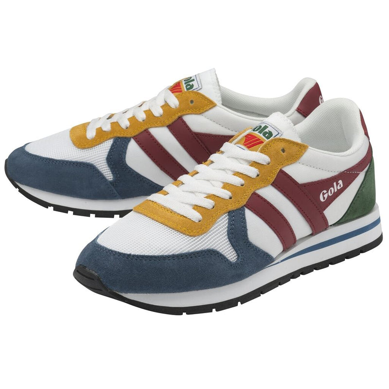 Gola Daytona for men is a vintage jogger with a '90s color palette. This reimagined running silhouette from the Gola archives features an EVA stripe midsole and cleated outsole with a quad-color upper. This heritage sneaker ups the ante in summer footwear, giving a striking blue baltic,red and dark green pop to an outfit.