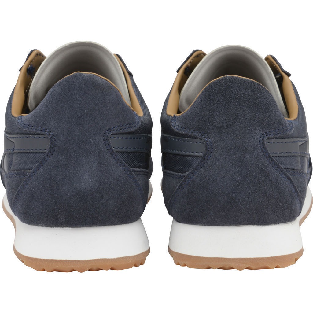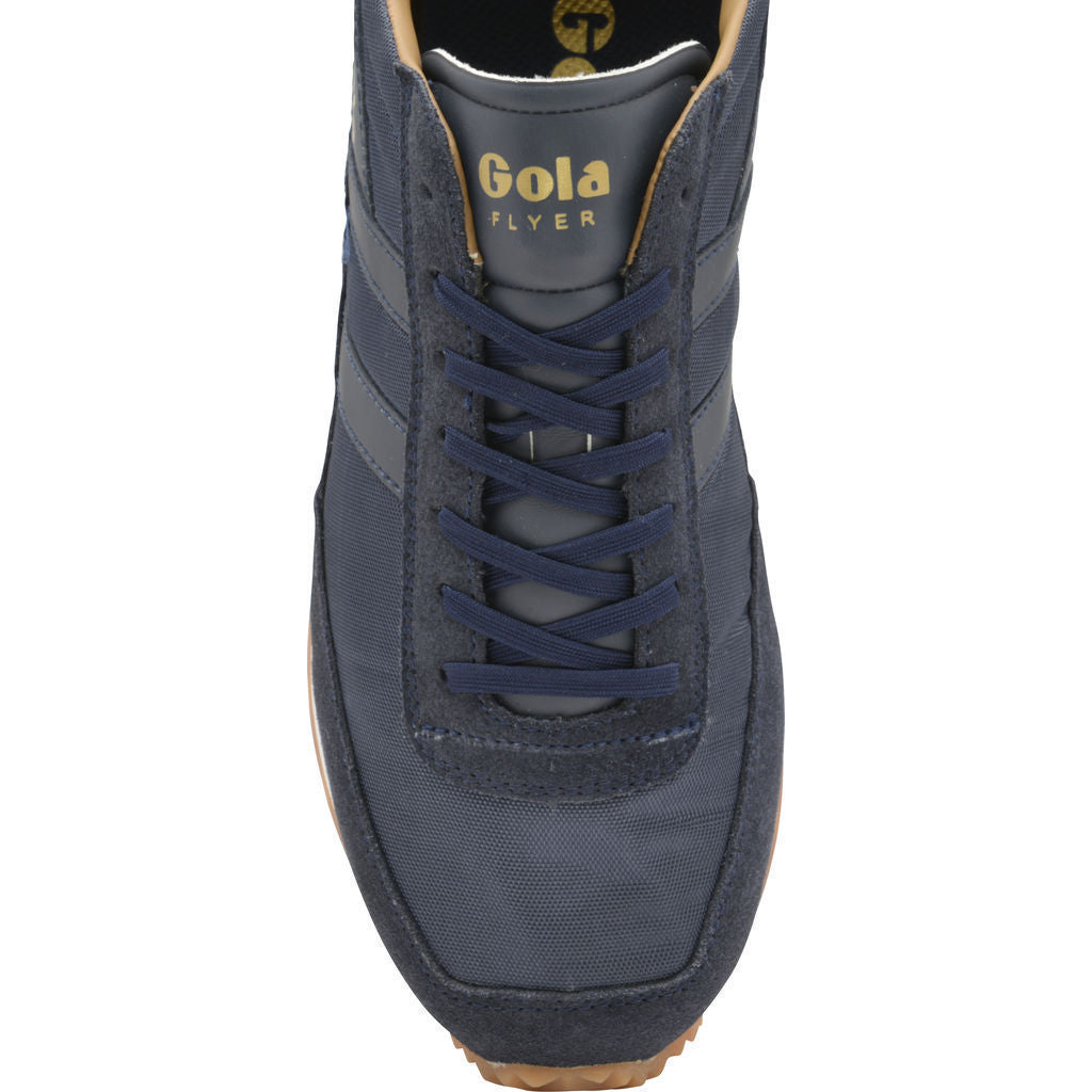 Drawing its namesake from the iconic 1975 Flyer style, this lightweight Gola Classics Sneaker combines a jogger silhouette with modern construction. Their newest season of men's Flyer Shoes boast fresh and current colorways that lead with a contemporary edge in addition to the heritage design. Crafted from a navy blue nylon/suede upper, this athletic sneaker is complete with Gola's signature wingflash and branding.