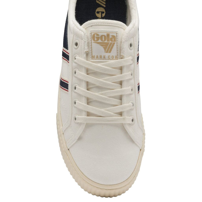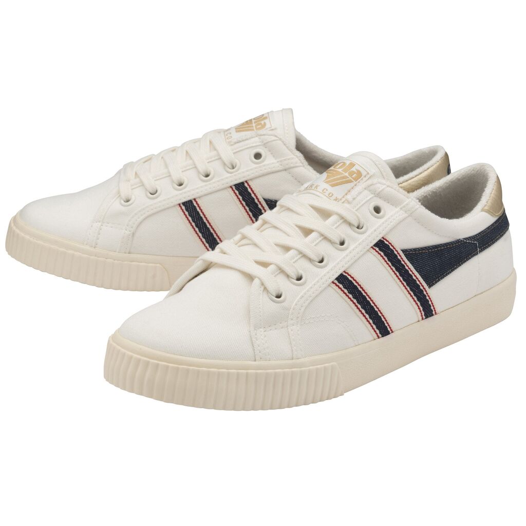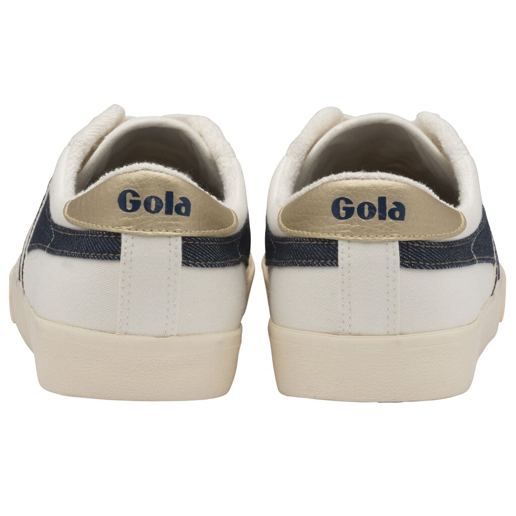 Inspired by the season's trend of re-purposed vintage denim, Tennis Mark Cox Selvedge for men in off white/indigo is a reworked edit of a classic court plimsoll from Gola's back catalogue. This wardrobe essential combines a simple off white canvas upper and denim trim with a heritage silhouette, clean lines and a pop of gold to offer a go-to, wear anywhere classic men's trainer option.